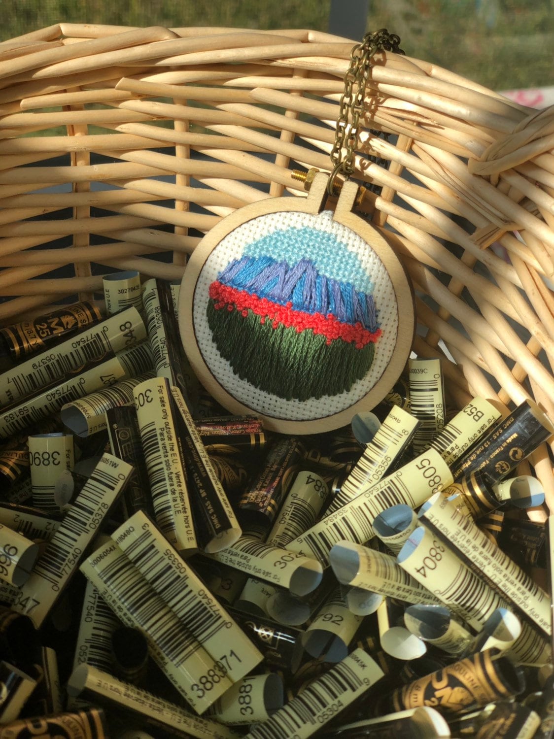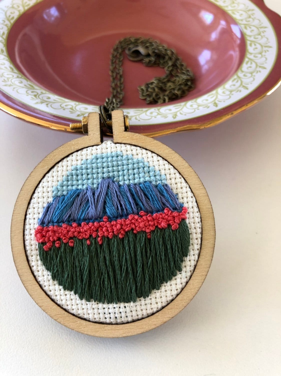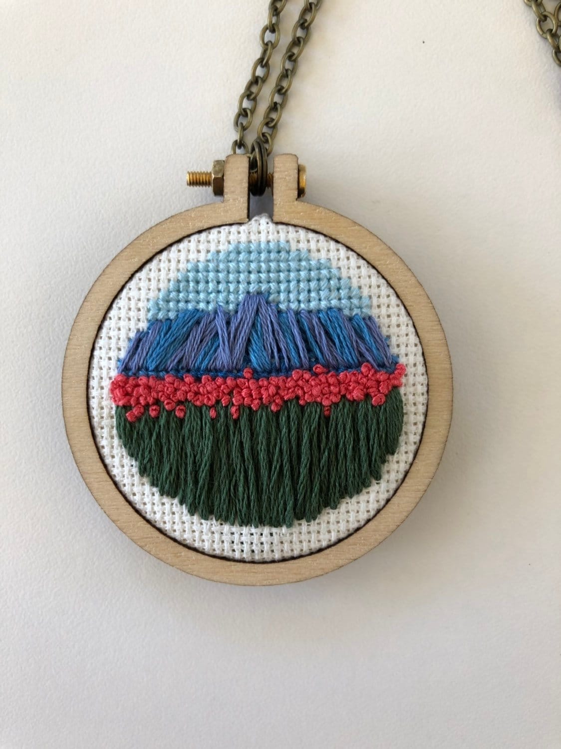 Large pendant with embroidered red, emerald stemmed tulips and mountain landscape.